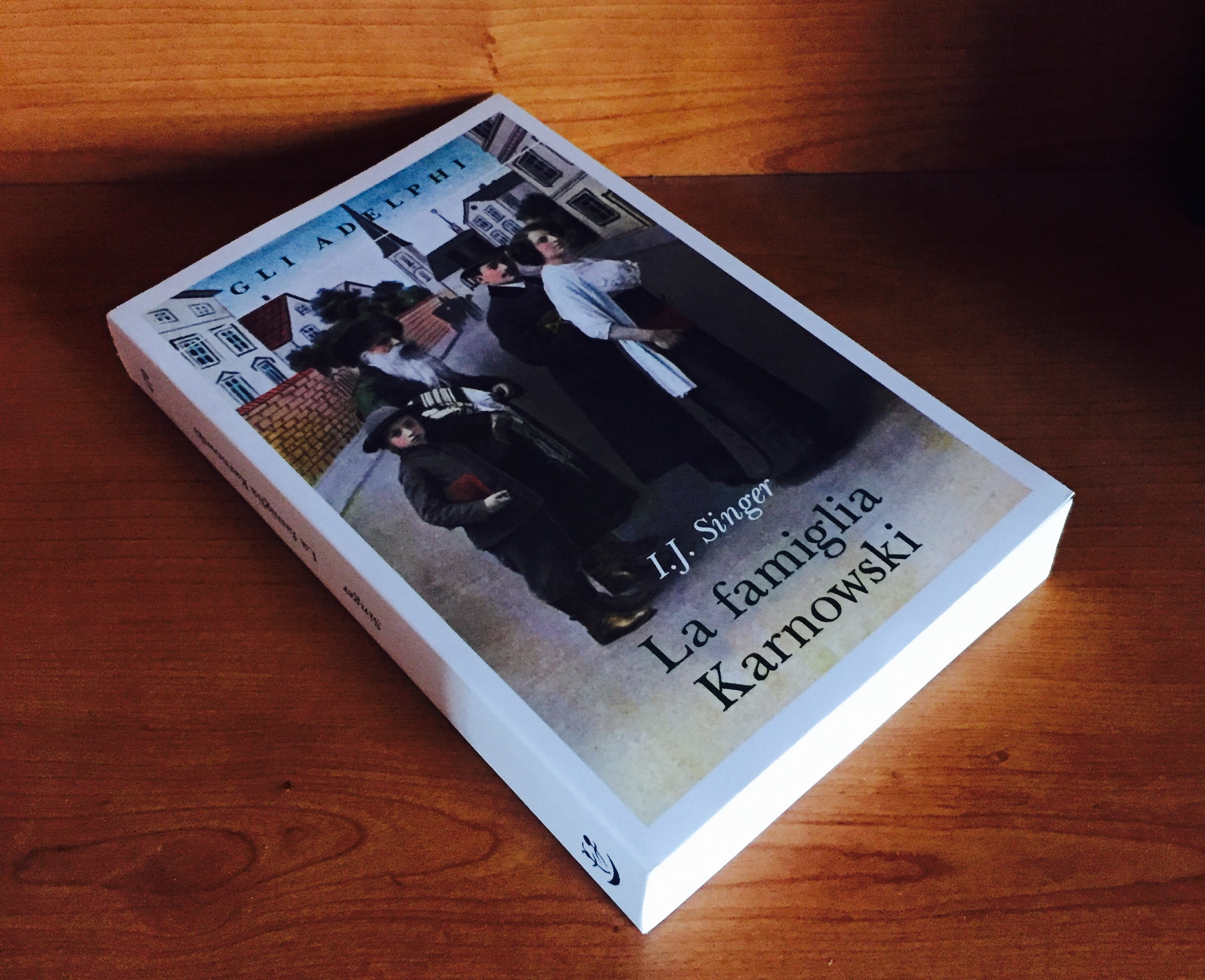 “La famiglia Karnowski”, Gli Adelphi 2013, odore leggero e antico, pagine sottili. Il primo capitolo scritto al passato remoto, il secondo al presente indicativo. Poi si alternano nei vari capitoli. Copertina morbida, non liscia, sembra di gomma, trattiene le dita che ci scivolano sopra. Bella l’immagine di copertina, una cartolina d’auguri per il Capodanno ebraico dei primi del Novecento in Germania.